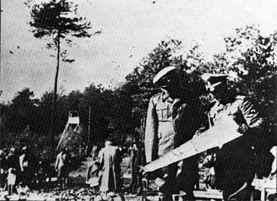 Photo taken on the same day and on the same line as Photo 1 showing the laying of the stone bed of the Ringstraße between Krematorien IV and V in the summer of 1942. In the right foreground are two Bauleitung officers consulting a drawing, probably that of the road They are SS Captain Karl BISCHOFF, head of rhe Bauleitung, and SS Second Lieutenant Walter DEJACO, head of the Drawing Office. Behind Bischoff, on his right, is a civilian. probably an employee of Lenz & Co. one of the civilian firms working at Birkenau on the construction of the POW camp. Lenz & Co specialized mainly in site levelling, work that preceded the building of the suceessive construction stages (Bauabschnitt) of Birkenau.