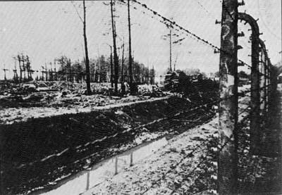 In the summer of 1944, the Sonderkommando men asked the camp resistance for a small camera so that they could record the criminal tasks they were forced to carry out: emptying of the gas chambers and incineration of the bodies. The Sonderkommando organized some damage to the roof of the gas chambers of Krematorium V and requested repairs. The internal camp resistance then came into action. A “flying squad” to which Szmulewski, a member of this organization, belonged came to repair the damage. Szmulewski was carrying a dixie can with a false bottom in which the camera was hidden. Once the prisoner-repairmen were on the roof, Szmulewski passed the camera to a Sonderkommando man working at the cremation ditch who had placed himself against the north wall of the gas chambers, under the roof overhang which was 2.45 from the ground. This prisoner then quickly entered the north gas chamber whose door was open for ventilation purposes. There he was safe, as the room had already been emptied of corpses. From the centre of this room he took two photographs of his comrades feeding bodies into the cremation ditch. Then, hiding the camera in his right hand, he emerged from the building and went along the north wall to the eastern end of the building then about 30 metres into the wood, moving parallel to the eastern end of the building, under the cover of the trees. In front of the Krematorium, to the south, a group of women considered unfit for work, the next “batch”, was undressing. Some of them were already naked, a little way away from the others, taking a few steps while waiting. The sun was shining right in his face, through the trees lining the Ringstraße, so there could be no question of using the camera normally, using the viewfinder as he had done in the gas chamber. From rather far away, so as not to be noticed, he took a first picture of the women by guesswork. holding his right arm against his side with the camera in his palm. Hidden behind a tree, he wound on the film, emerged and took another picture in the same way as before. The direction the lens was pointing in was difficult to judge under these conditions and he pointed the camera too high, photographing the tops of the trees instead of the women [Photo 18]. Retracing his steps, he returned to the comparative safely of the Krematorium, moving along the north wall to the gas chambers. Szmulewski was watching out for him. A quick look round, no SS. The Sonderkommando man held up the camera which rapidly changed hands again [see the photograph showing the assumed path of the photographer]. Szmulewski replaced the camera in the bottom of the dixie, the repair was completed and the flying squad departed. The whole process had taken only fifteen to thirty minutes. The photos were taken out of the camp and handed over to the Polish resistance in Cracow.