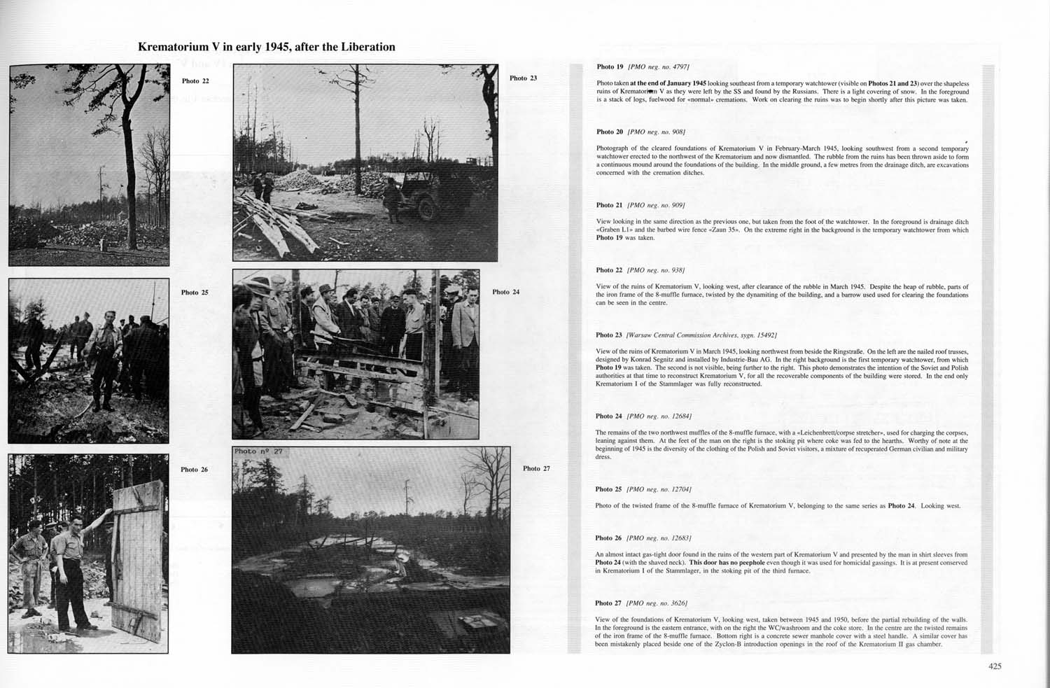 View of the foundations of Krematorium V, looking west, taken between 1945 and 1950, before the partial rebuilding of the walls. In the foreground is the eastern entrance, with on the right the WC/washroom and the coke store. In the center are the twisted remains of the iron frame of the 8-muffle fumace. Bottom right is a concrete sewer manhole cover with a steel handle. A similar cover has been mistakenly placed beside one of the Zyklon B introduction openings in the roof of the Krematorium II gas chamber. |