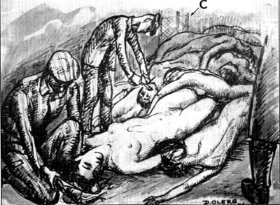 | Sketch by David Olère, dating from 1946, showing a “barber” (in the the Foreground) and “dentist” (in the middleground) at work on bodies INSIDE the Krematorium III gas chamber, as shown by a wire mesh Zyklon B introduction column [C] in the background. It should be noted that the SS probably considered that the extracction of gold teeth should be done immediately on opening the gas chamber in order to avoid the “organized losses” that could occur over the short distance from the basement to the ground floor |